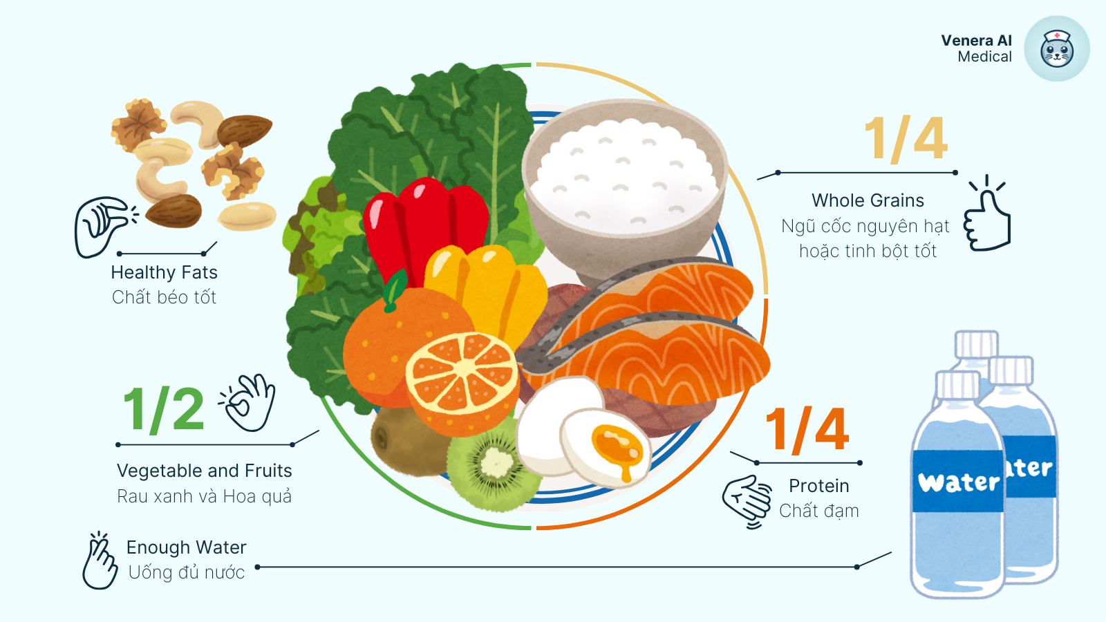 Bữa ăn Cân bằng: Áp dụng mô hình "Healthy Eating Plate" của Harvard: 1/2 đĩa là rau củ/trái cây, 1/4 ngũ cốc nguyên hạt, 1/4 protein tốt. Nguyên tắc này giúp kiểm soát khẩu phần dễ dàng, no lâu, và tránh thèm ăn vặt.