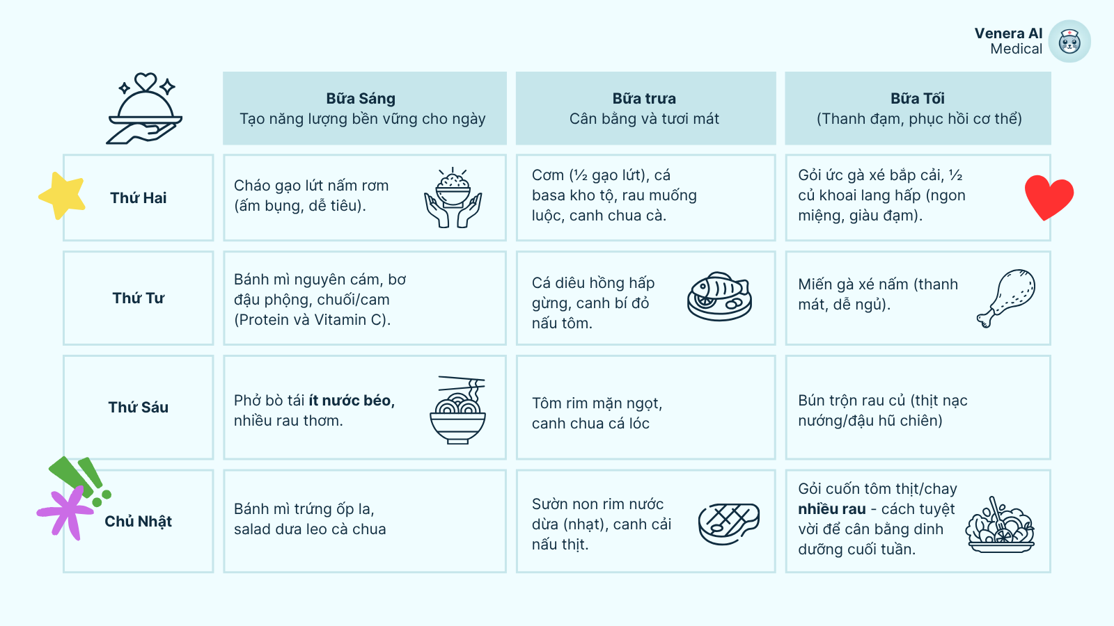 Dưới đây là một gợi ý thực đơn của 4 trên 7 ngày được đưa ra bởi trợ lý sức khỏe cá nhân thông minh Venera, giúp bạn khởi động hành trình Dinh dưỡng Chủ động, tận dụng tối đa sự phong phú và thanh đạm của ẩm thực Việt: Trợ lý sức khỏe thông minh Venera còn có thể giúp bạn tạo thực đơn cá nhân dựa theo nhu cầu sức khỏe và dinh dưỡng theo tuần hoặc theo tháng.